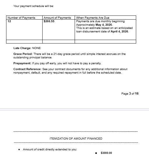 This section may also include an itemization of the amount financed, showing where the loan proceeds are going and to whom. In simpler loans, this may just reflect funds disbursed directly to you. In more complex products—such as debt consolidation loans—this can include payments made directly to creditors on your behalf, which can make the breakdown more detailed.
