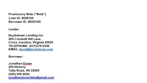 Tulip Road, VA 22500, promises to pay to the order of BOYLEDOWN Lending Inc. (“LENDER”), a Virginia-licensed consumer finance company, License No. CFI-256, the principal sum of $3000.00, together with simple interest at the rate of 12% per annum, accruing from the date funds are disbursed to BORROWER.